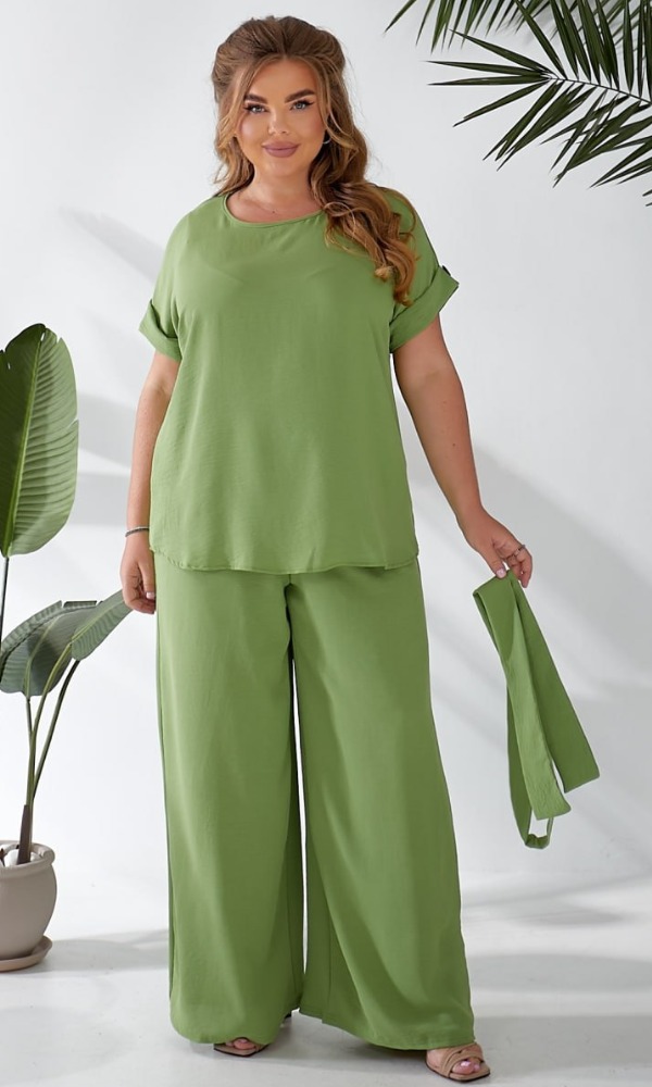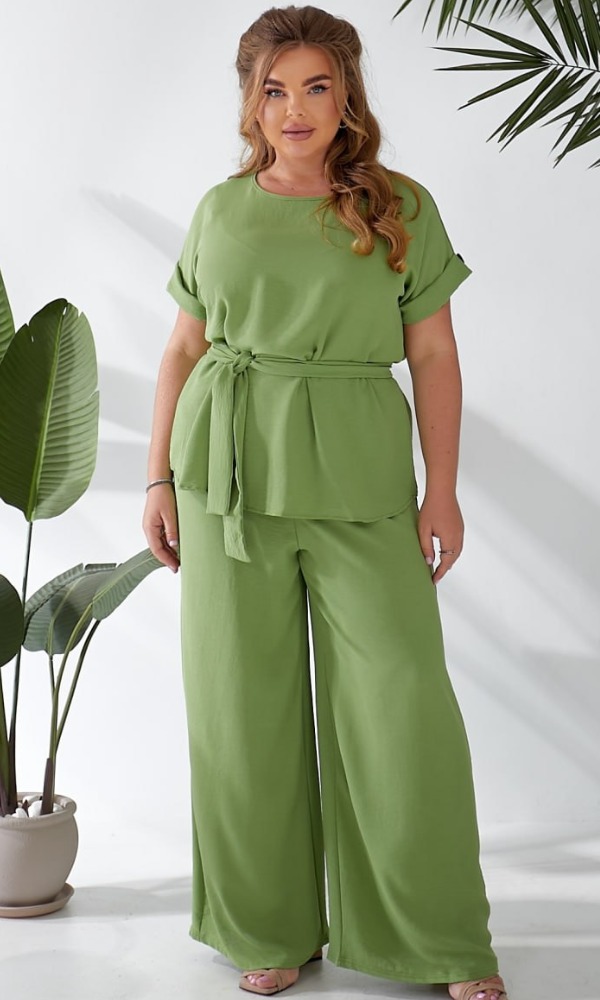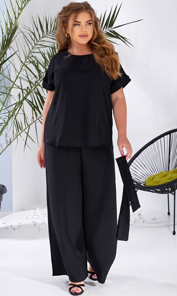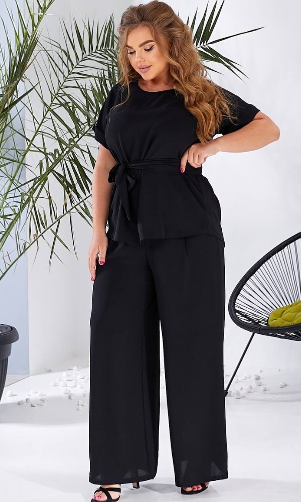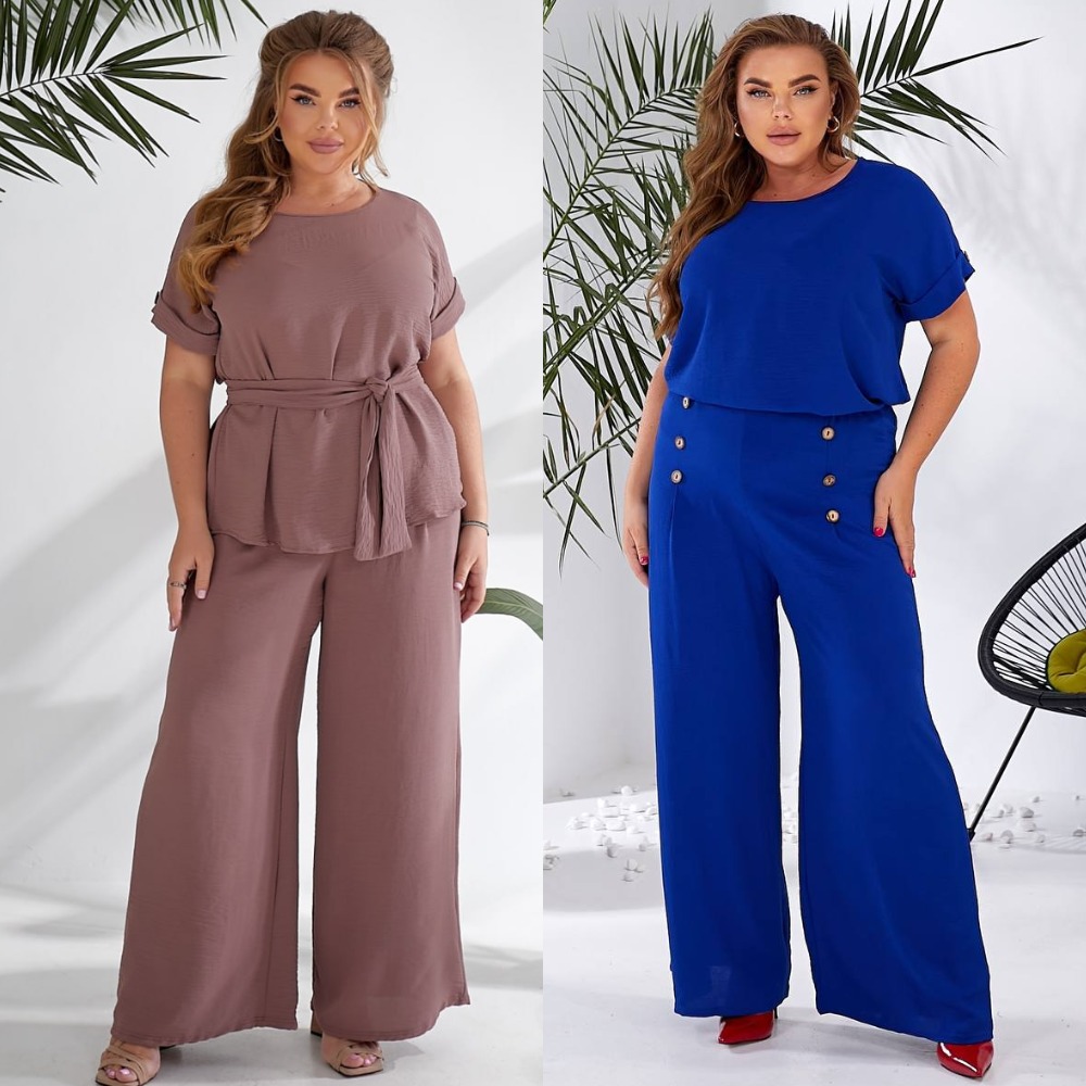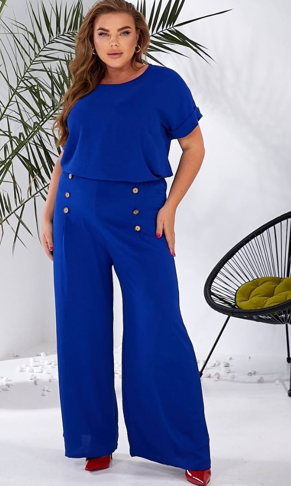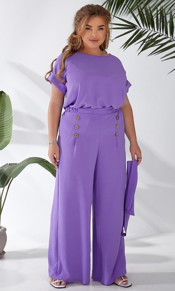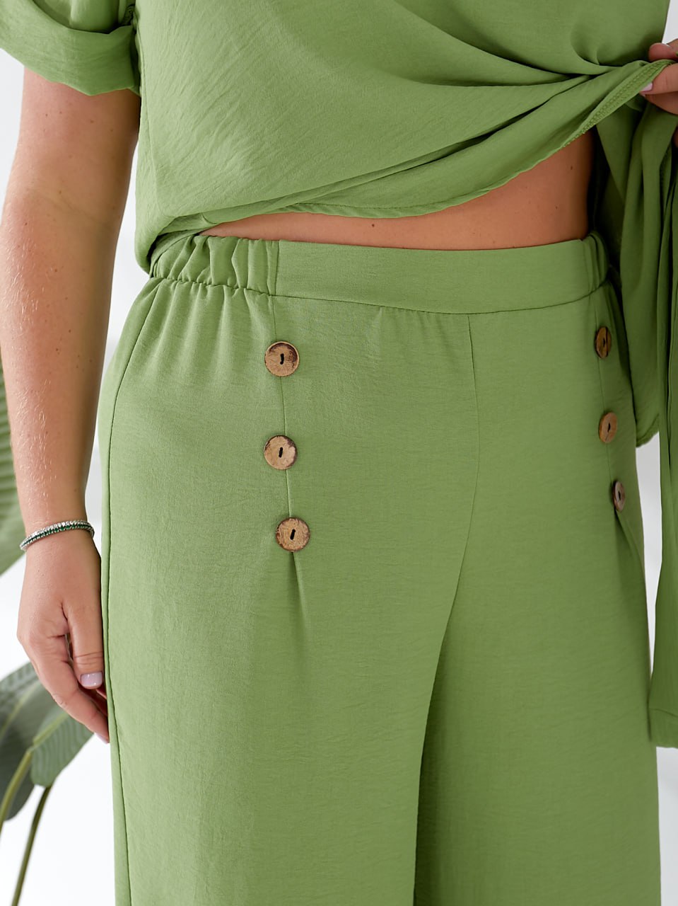 Штани по верху з поясом на гумці. Також по верху передніх половинок односторонні складки, декором служать гудзики.