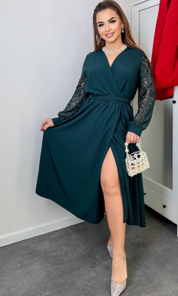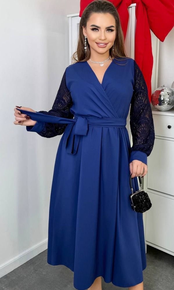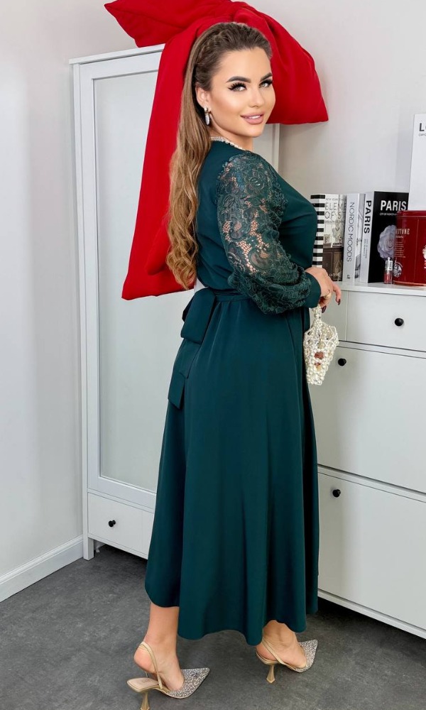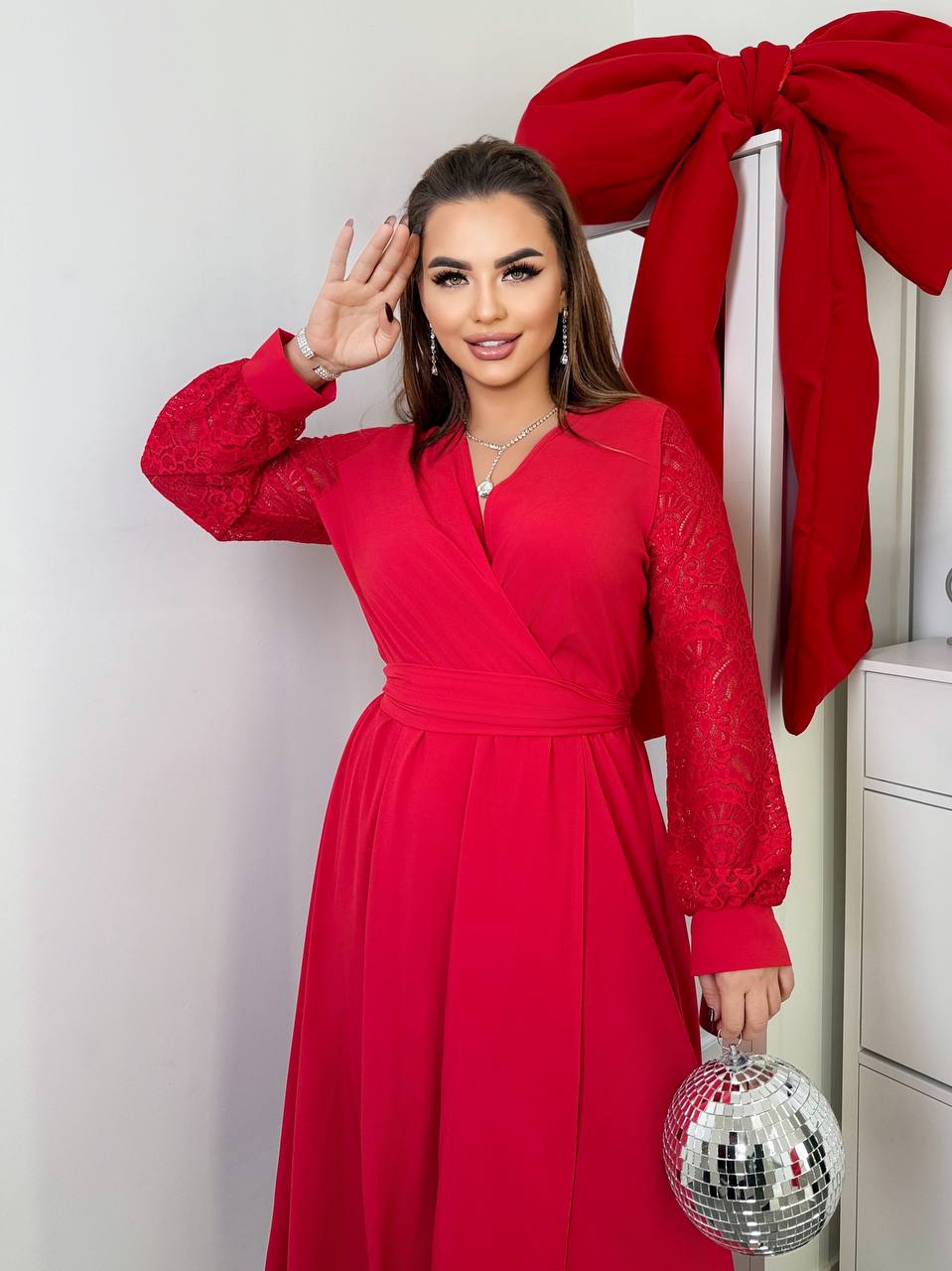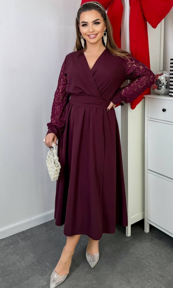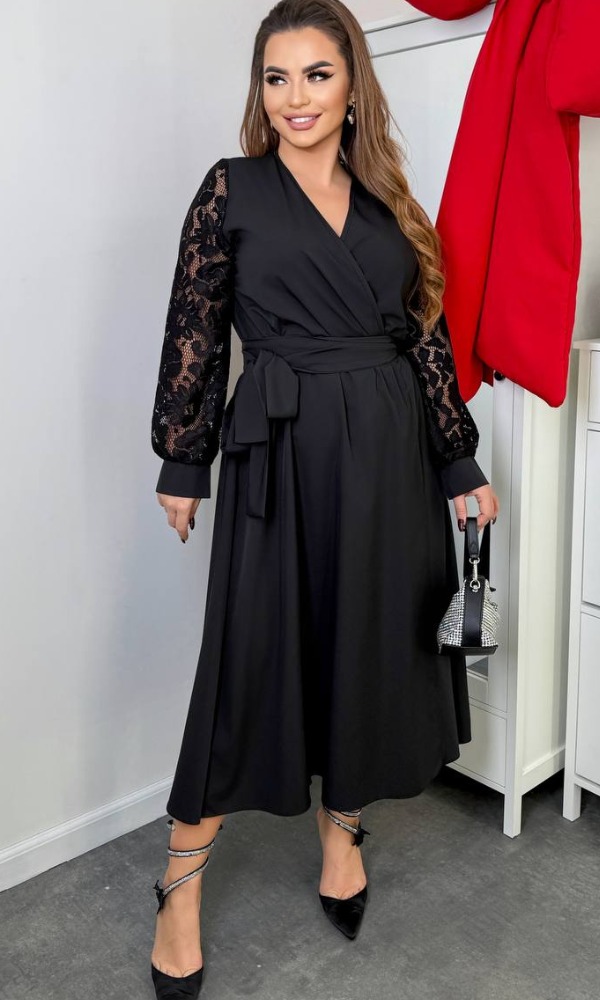 Ліф та спідниця мають запАх, по талії зібрано на резинку. Рукави виготовлені із гіпюру, на манжеті. Пояс із основної тканини в комплекті. Кишень та застібок немає.