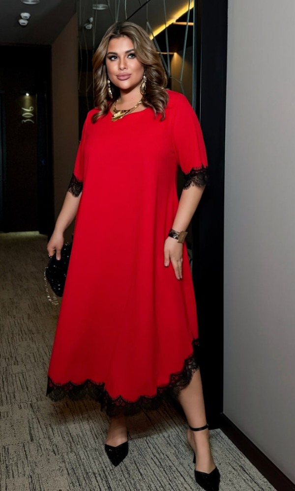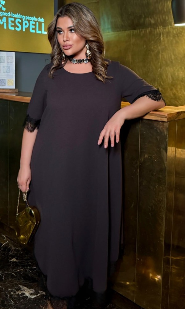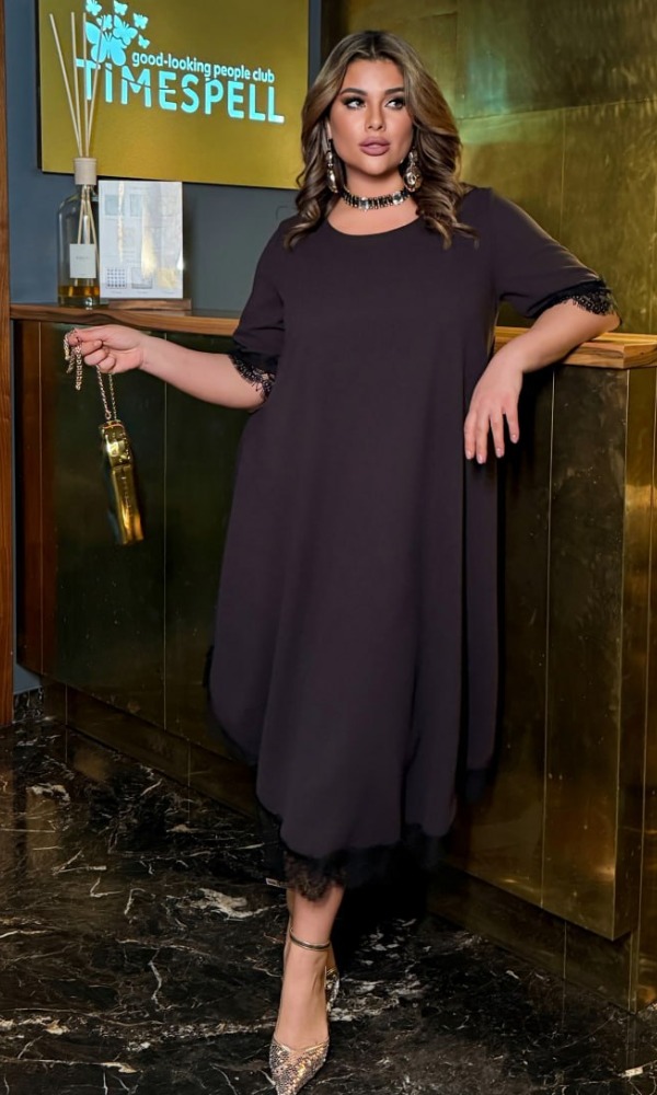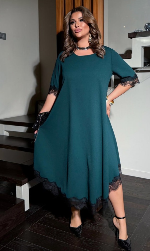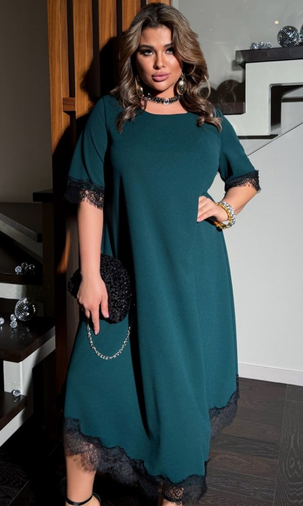 Стильна сукня у вечірньому стилі, довжиною міді, А-подібного силуету. Виріз горловини круглий. Рукав довжиною трохи нижче ліктя. Сукня по рукавам та низу декорована чорним мереживом. Кишень та застібок немає.