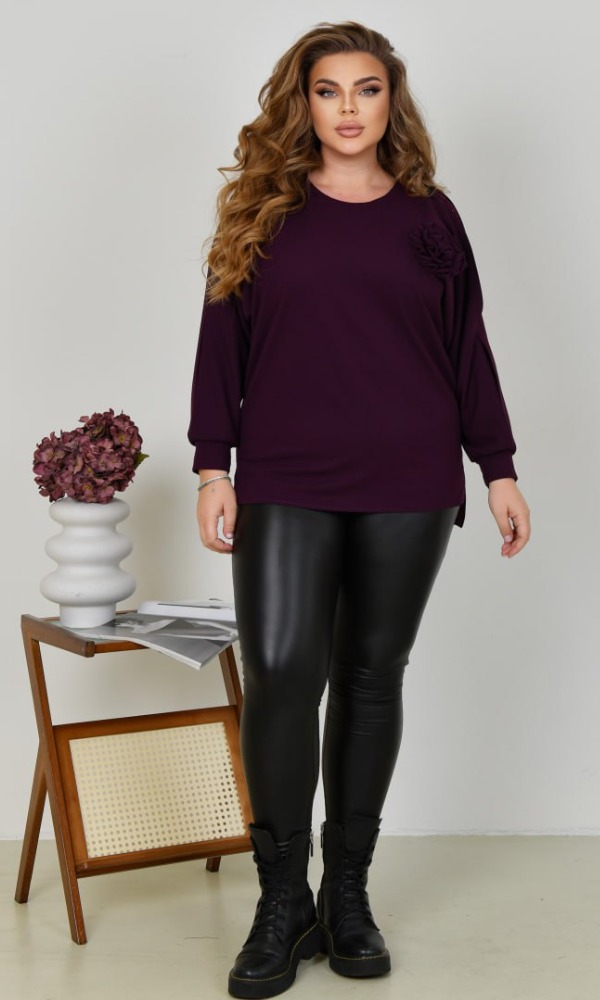 Стильна туніка вільного прямого силуету із трикотажу креп-стретч (розтяжність середня), виріз горловини круглий, рукав з гіпюровою вставкою. Низ асиметричний, з невеликими розрізами. Туніку декоровано трояндою із основної тканини (за потреби можна зняти).